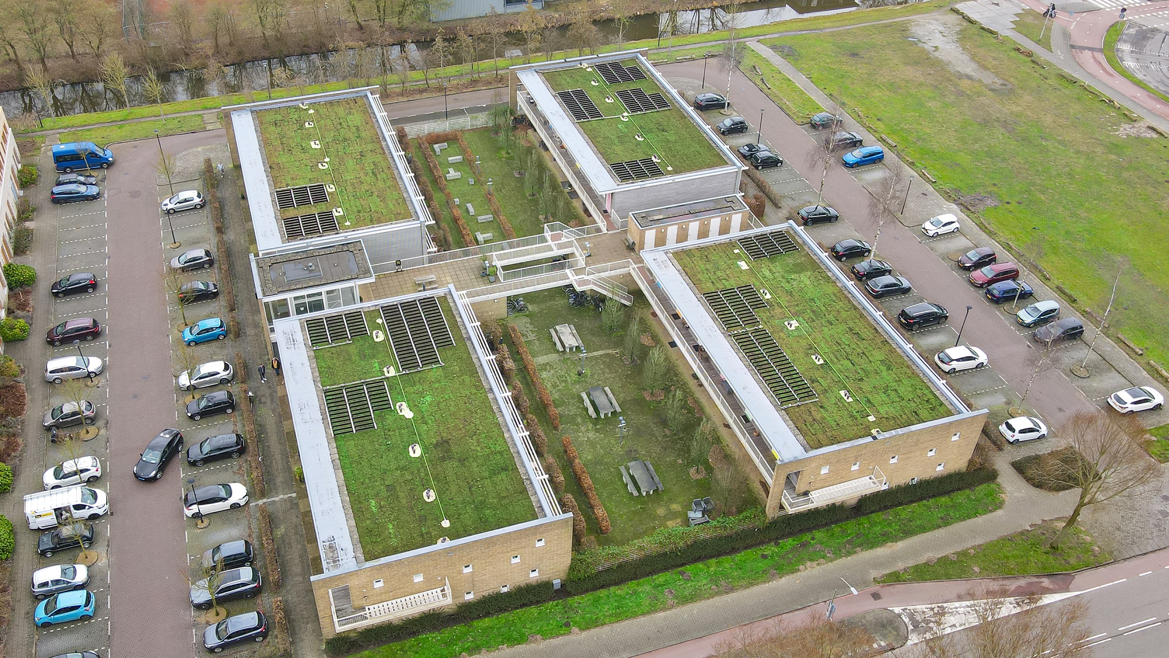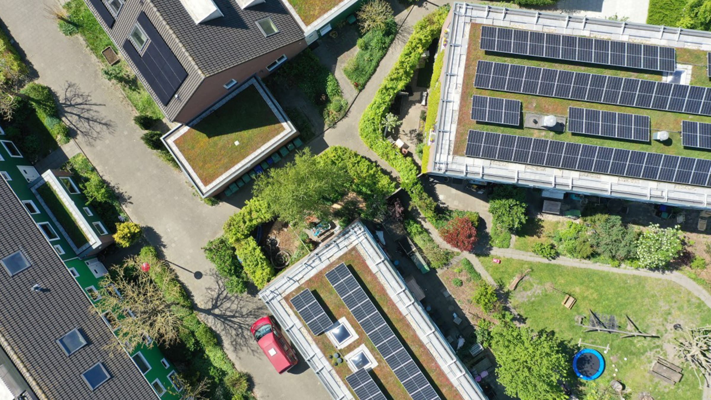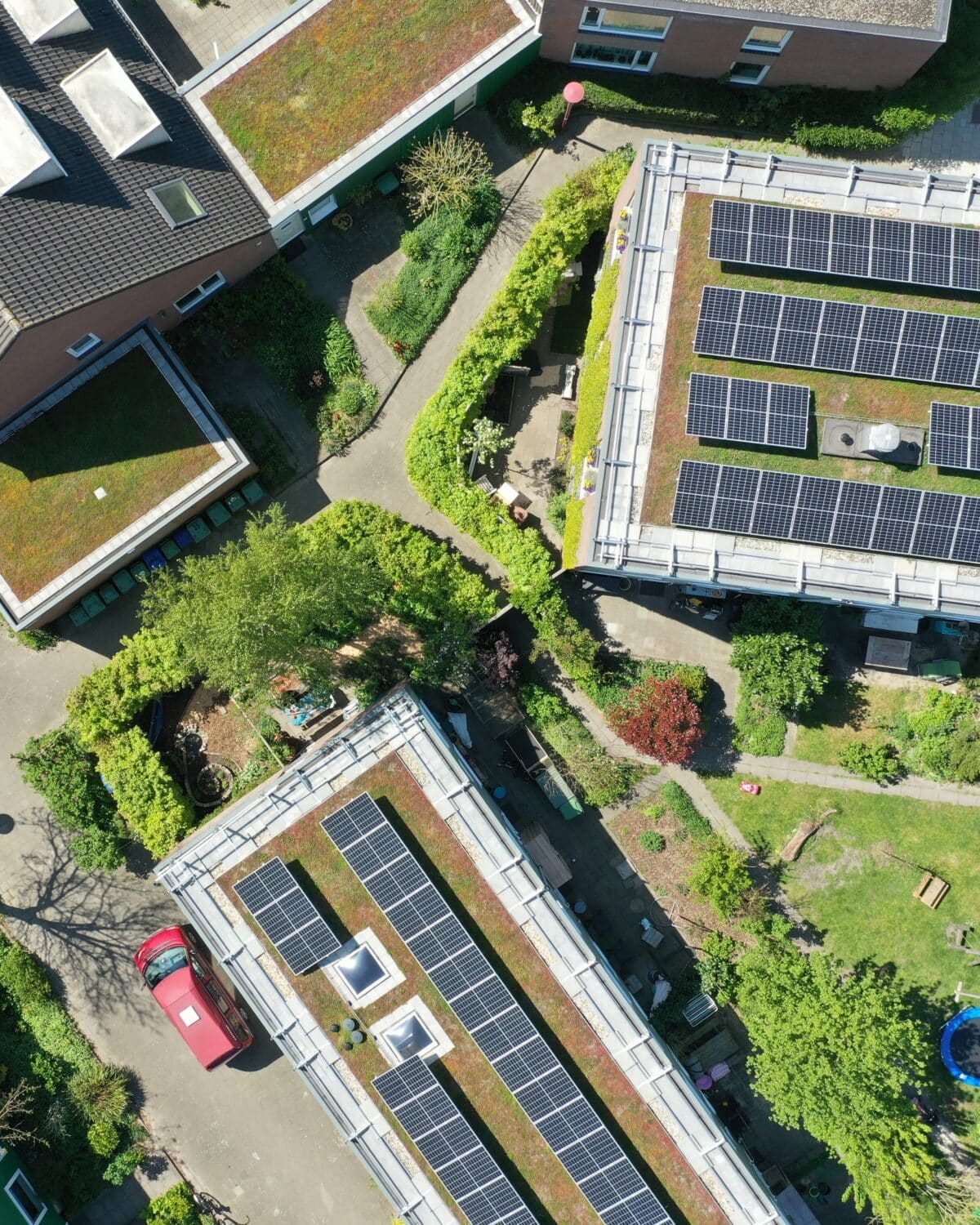 VVE Maccabiadelaan realised the first Dutch green roof combined with Over Easy Solar units — 500 m² Sedum and 94 panels.