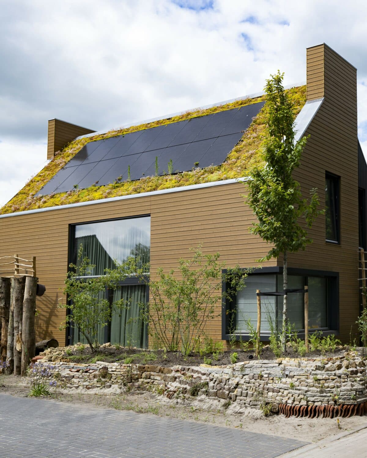 Solar panels can also be applied on pitched green roofs, combining energy generation with elegant design. They integrate smoothly into the architecture while maintaining optimal performance.