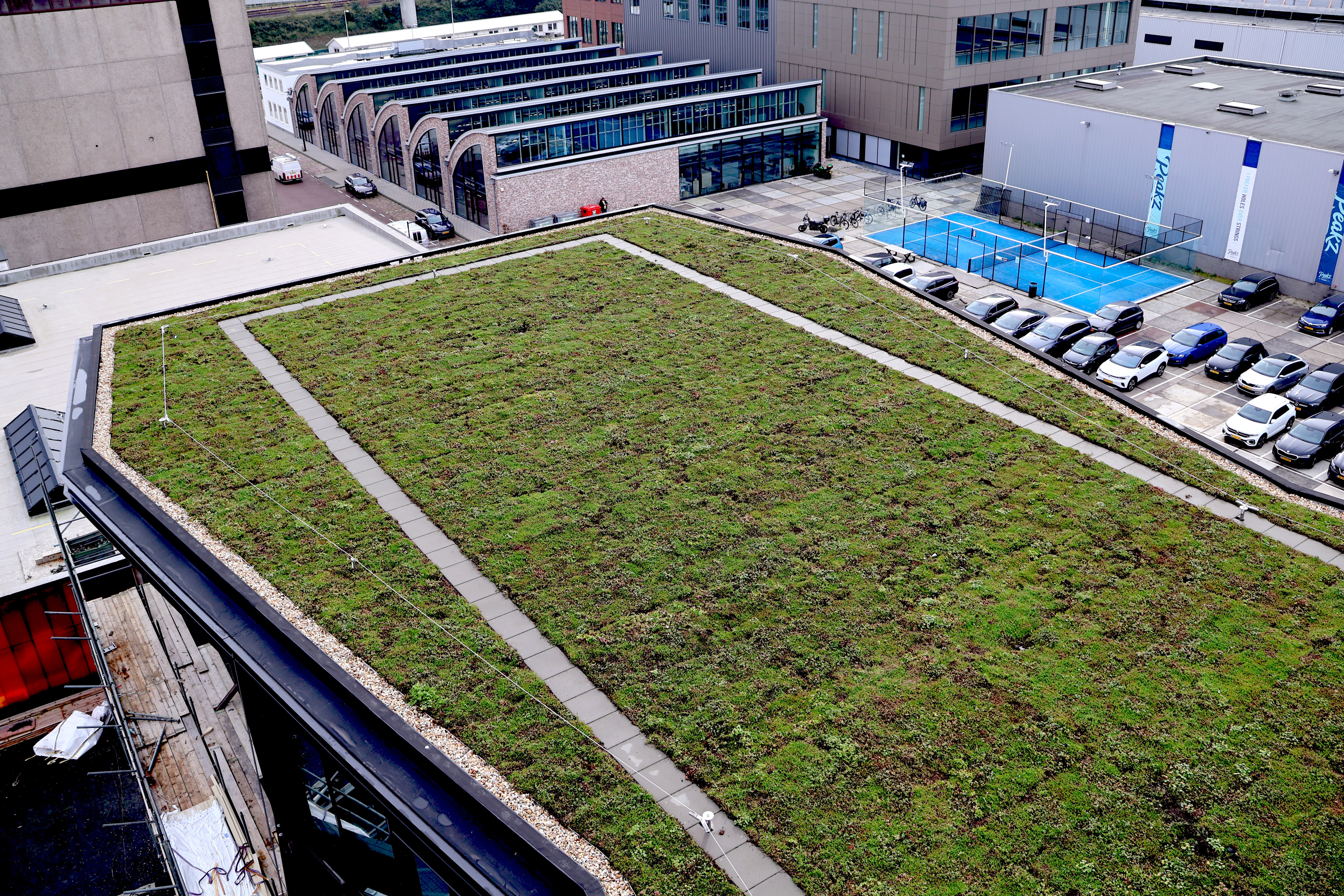 A blue-green roof combines rainwater retention and storage (blue) with vegetation (green). It temporarily stores rainwater and uses it for irrigation of the plants or releases it gradually into the drainage system. The blue layer is a water retention system that buffers rainfall. This stored water can later evaporate or be used to irrigate the green layer. The green layer, typically consisting of Sedum, herbs, or grasses, provides cooling, improves air quality, and enhances biodiversity. By combining water management with vegetation, a blue-green roof is a multifunctional solution for stormwater management, climate adaptation, and urban liveability.