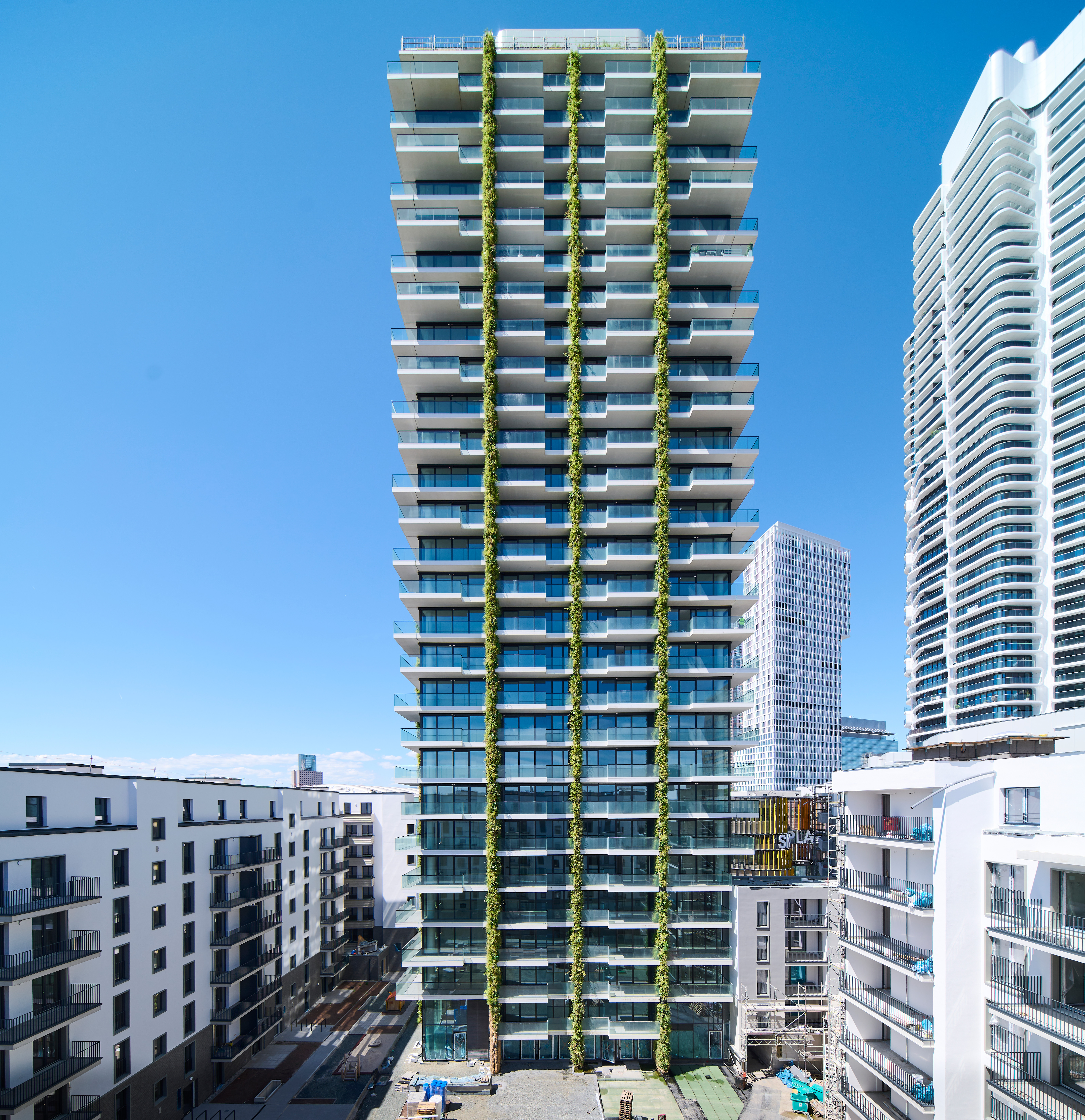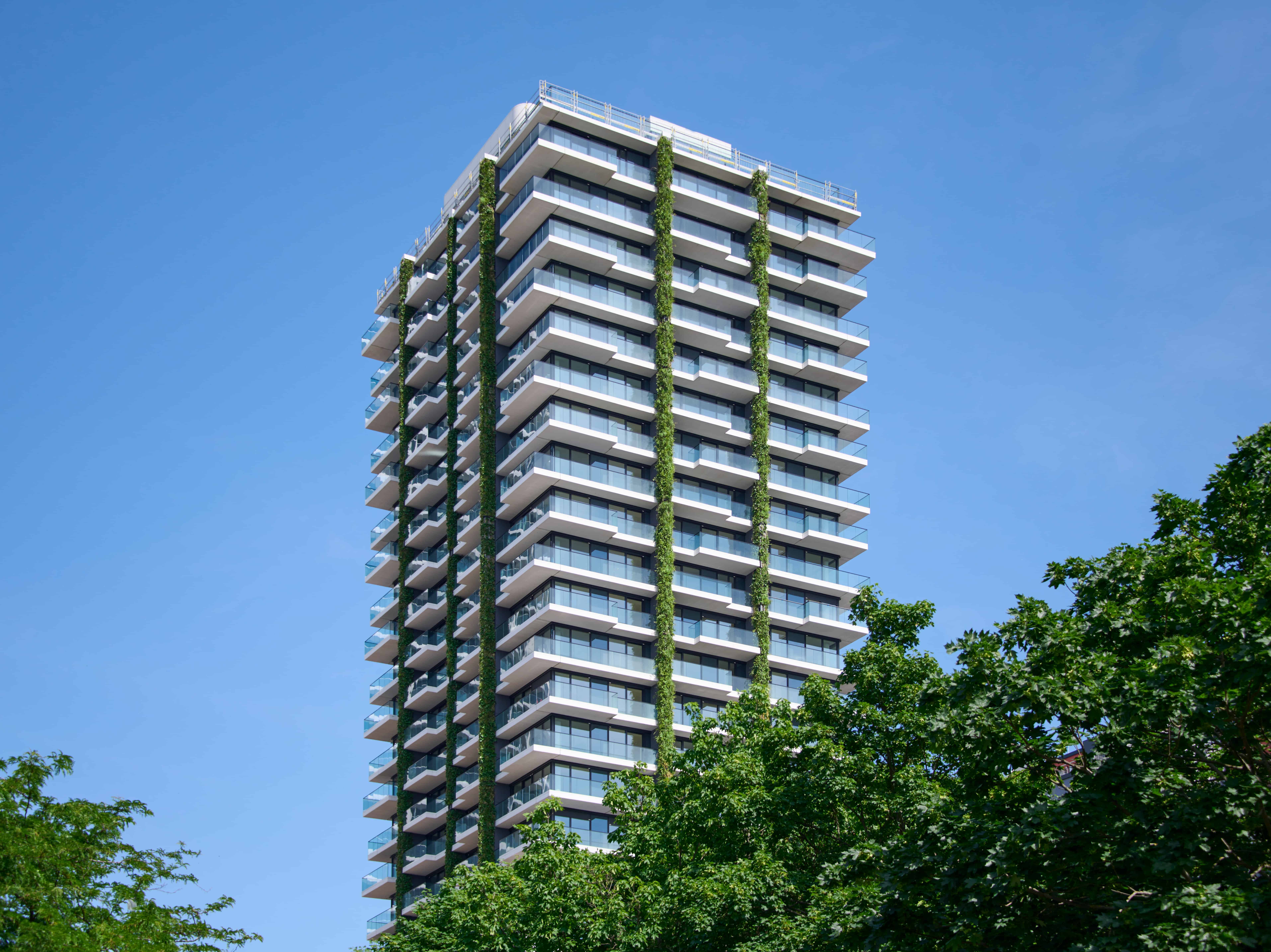 The project developed by Immobel Group is currently nearing completion. It offers 263 luxury apartments in a central location in Frankfurt am Main at the entrance to Europa Allee and near the business districts, the train station and the exhibition centre. The eye-catching building is not only beautiful to look at; large floor-to-ceiling windows in most rooms offer spectacular views of the city and the modern interiors create a special atmosphere full of natural light. Currently, a living wall is also being installed in the lobby. Nature is hereby extended from the outside in, creating an inviting reception for residents and visitors of this iconic tower!