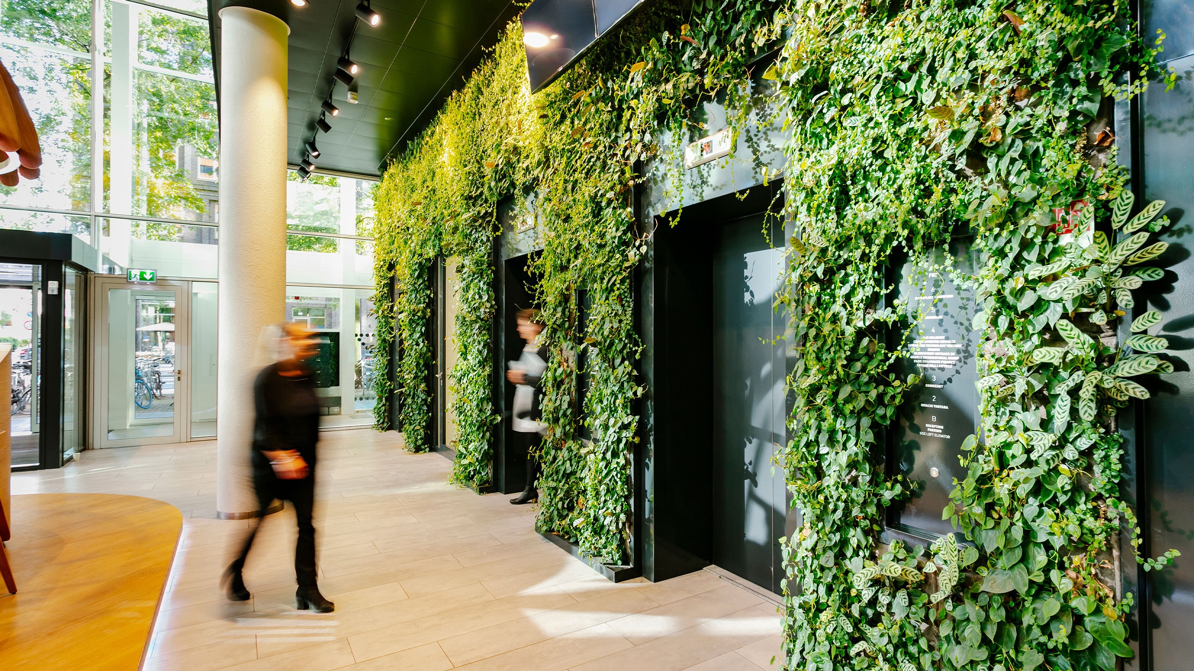 Pre-grown plant walls add immediate atmosphere, comfort and warmth to the tall entrance hall.