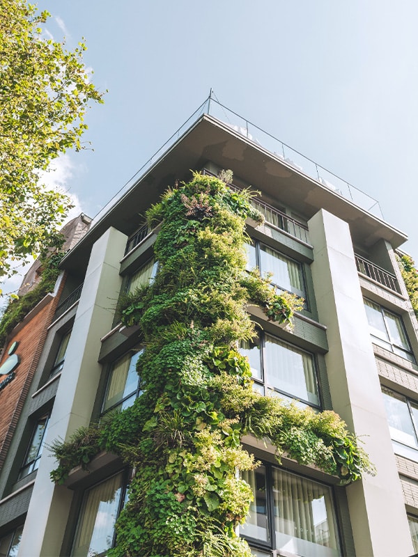 Żywa ściana chroni fasadę przed słońcem, deszczem, wiatrem i zmianami temperatury, wydłużając jej żywotność.