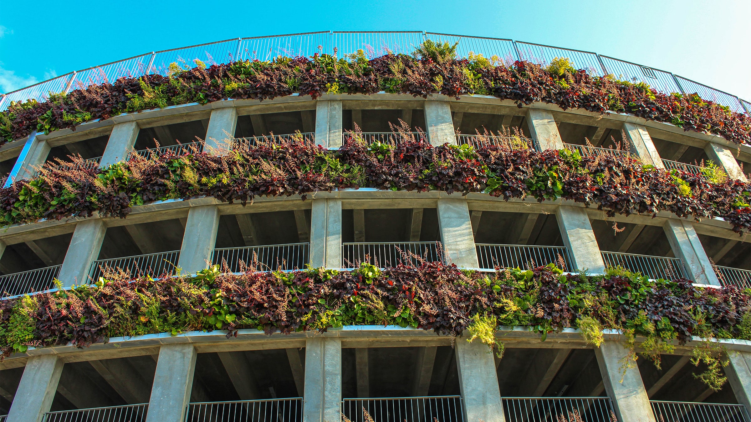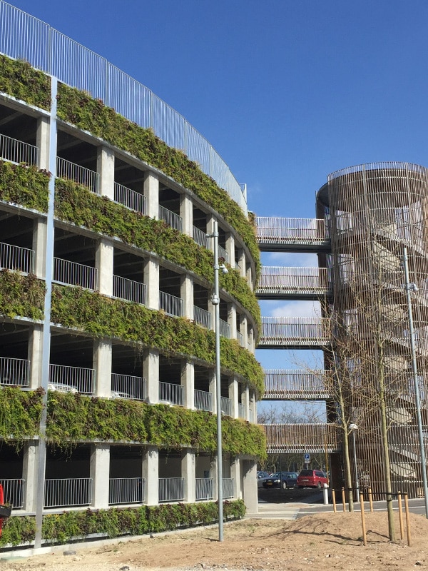 W 2015 roku wokół całego garażu zainstalowano zewnętrzną ścianę SemperGreenwall, przekształcając to, co mogło być czysto funkcjonalną strukturą, w żywy, oddychający element architektury. Fasada, wykonana ze wstępnie wyhodowanych paneli Flexipanels, zawiera starannie dobraną mieszankę kwitnących roślin wybranych ze względu na ich zdolność do rozwoju zarówno w słonecznych, jak i zacienionych warunkach. W zależności od pory roku ściana zmienia kolor i fakturę, tworząc dynamiczny i stale ewoluujący wygląd.