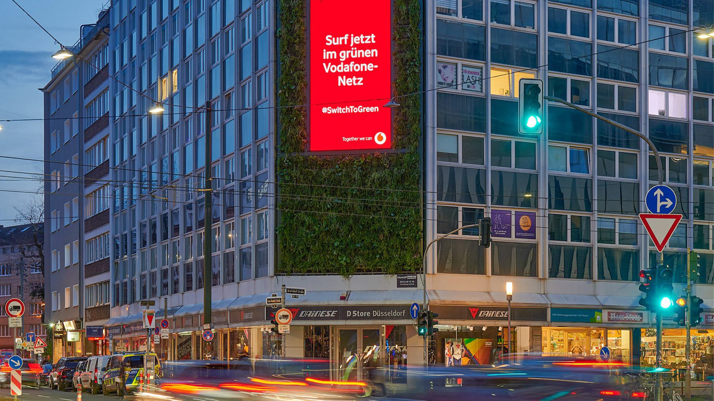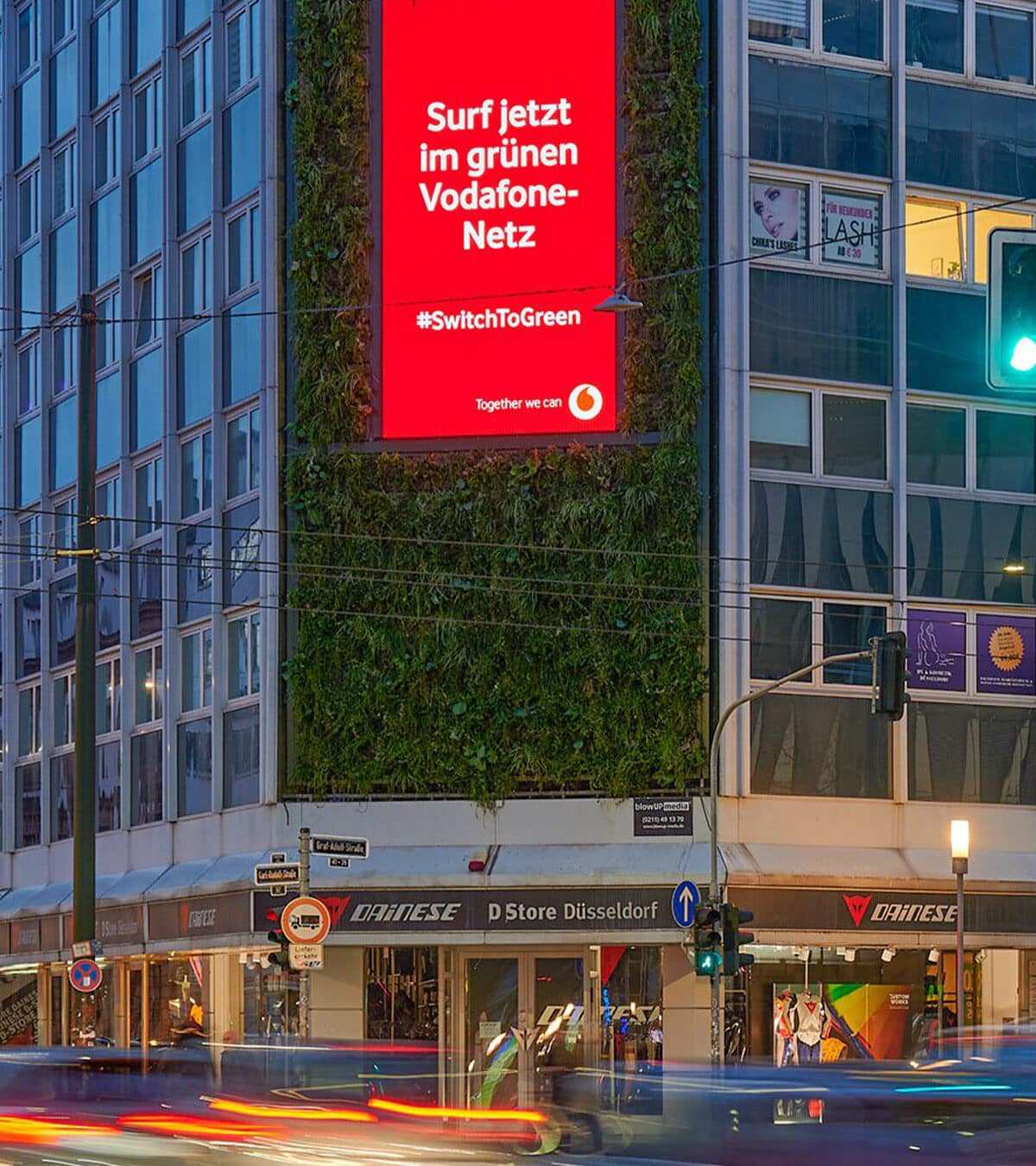 W centrum Düsseldorfu, na szerokiej i ruchliwej ulicy Graf-Adolf-Street, która biegnie z zachodu na wschód, zainstalowano SemperGreenwall o powierzchni 100 m² ze zintegrowanym ekranem cyfrowym o powierzchni 30 m². Ten ogromny ekran cyfrowy będzie wyświetlał reklamy Vodafone Germany, wieloletniego partnera reklamowego klienta blowUP media Germany. blowUP media, we współpracy ze Ströer Media Germany GmbH, angażuje się w ekologizację swojego portfolio wielkoformatowych reklam zewnętrznych za pomocą zielonych innowacji. Eksperci ds. nieruchomości z firmy StroehleinConsult wspierali projekt od koncepcji do jego realizacji. Dzięki tej żywej ścianie, blowUP media i Vodafone chcą "wprowadzić naturę tam, gdzie w przeciwnym razie jest na nią mało miejsca". Vodafone będzie wysyłać swoje zrównoważone komunikaty za pośrednictwem ekranu reklamowego.