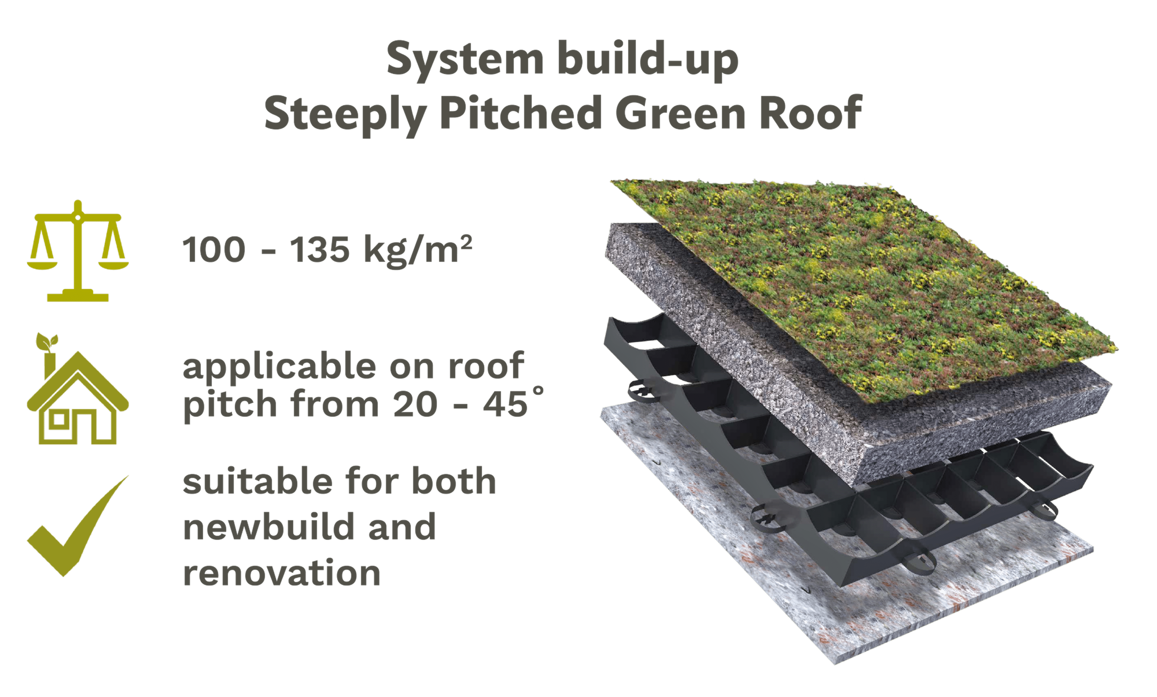 Podczas renowacji i konserwacji domów w Bergen op Zoom (Holandia) zastosowano paroprzepuszczalny system zielonych dachów skośnych.