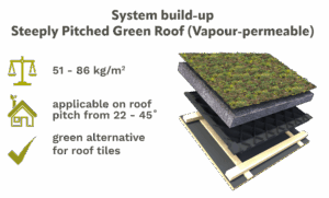 Drugą kwestią, która ma ogromne znaczenie dla realizacji renowacji z zielonym dachem, jest oczywiście nośność dachu. Masa naszych paroprzepuszczalnych systemów dachów zielonych wynosi od 51 do 86 kg/m2. Inne systemy dachów zielonych dla dachów spadzistych wahają się od 100 do 135 kg/m2.
