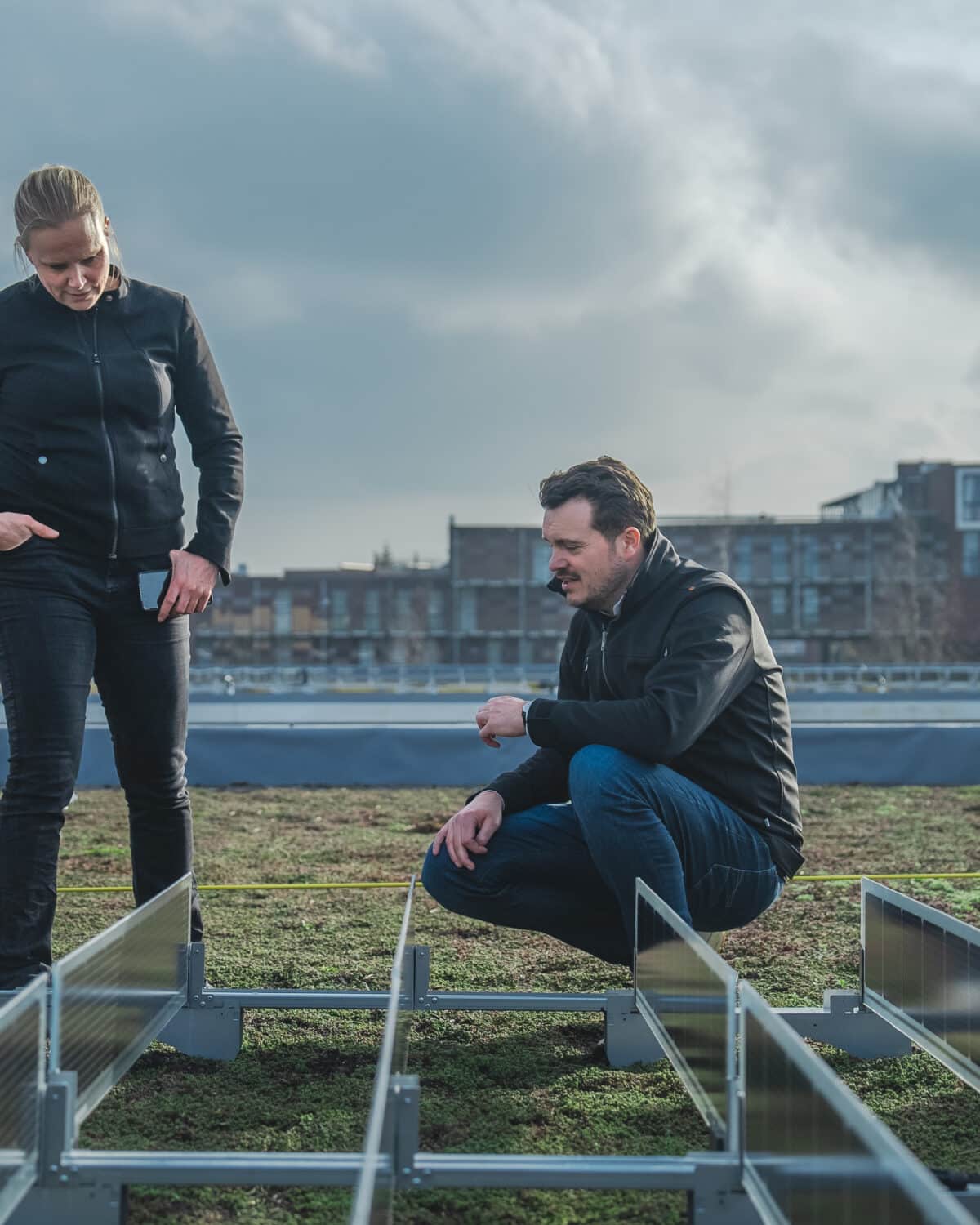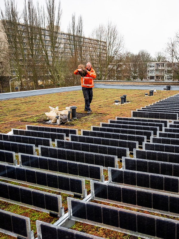 Sempergreen contrató a nuestros socios Wallaard (instalación de tejados verdes) y SamenStromen (instalación de sistemas de energía solar fotovoltaica) como socios de ejecución, cuidadosamente seleccionados entre varios candidatos. Juntos ofrecieron una solución integral que combina a la perfección la tecnología de cubiertas verdes y la energía solar. ¿El resultado? Una sinergia perfecta entre flora y energía solar, que optimiza cada centímetro cuadrado del tejado.