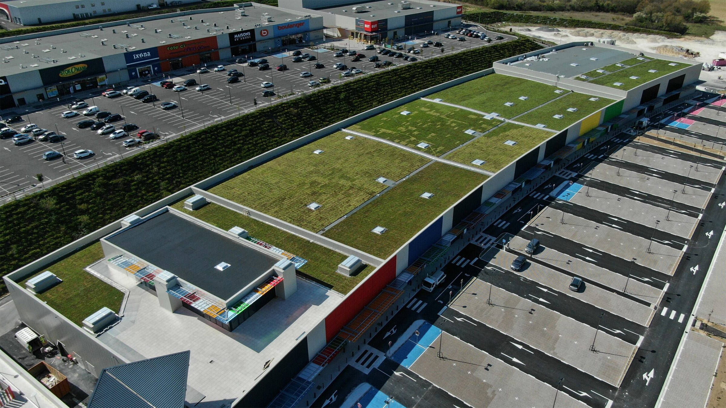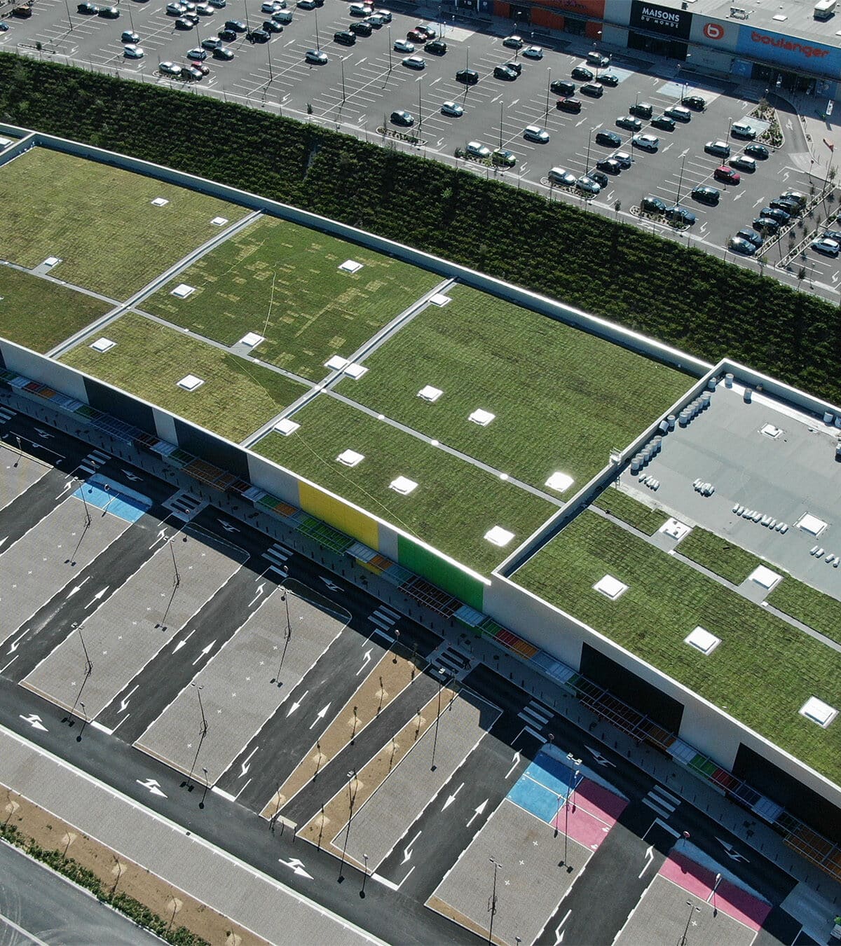 El parque comercial "ZAC des Montagnes Ouest" de Champniers se ha ampliado con un segundo parque comercial. La fase 2 consiste en la nueva construcción de 10 locales comerciales y 492 plazas de aparcamiento. La enorme superficie del tejado, de 8.400 m², fue dotada de una enorme cubierta verde amortiguadora de agua por 7 instaladores en sólo 8 días. Para la construcción de esta cubierta se eligió un sistema ligero de cubierta verde amortiguadora de agua con tepes de mezcla de Sedum Sempergreen, una estructura muy adecuada para edificios comerciales.