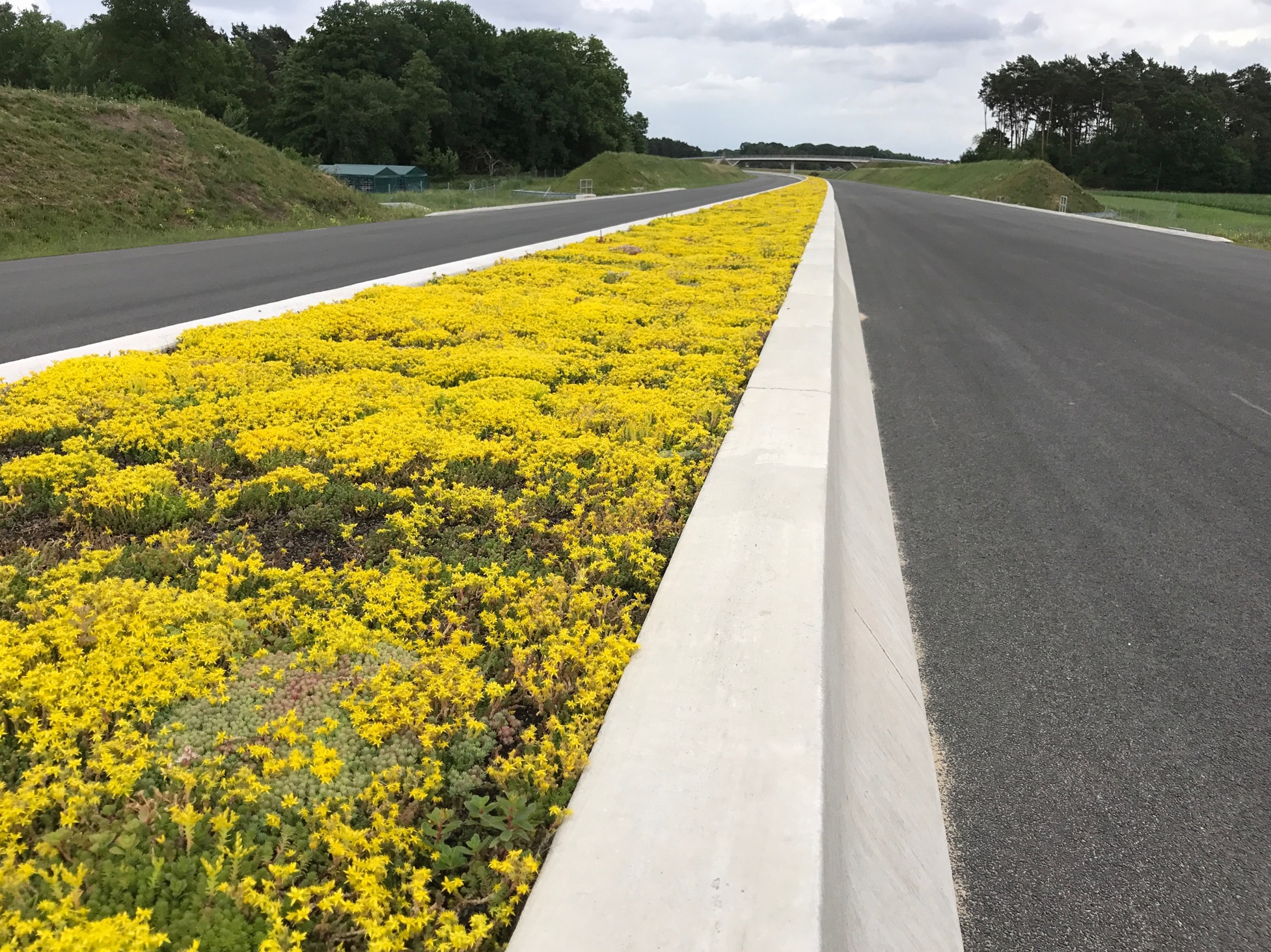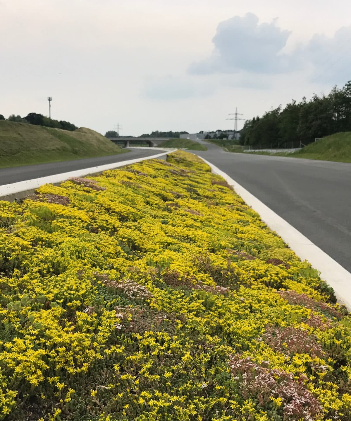 A lo largo de 7,9 kilómetros de la autopista alemana A33, cerca de Bielefeld, 11.500 m² de mantas de Sedum devuelven el verdor a la carretera. Esta solución de bajo mantenimiento evita el crecimiento de malas hierbas, filtra los gases de escape y da color a la carretera.