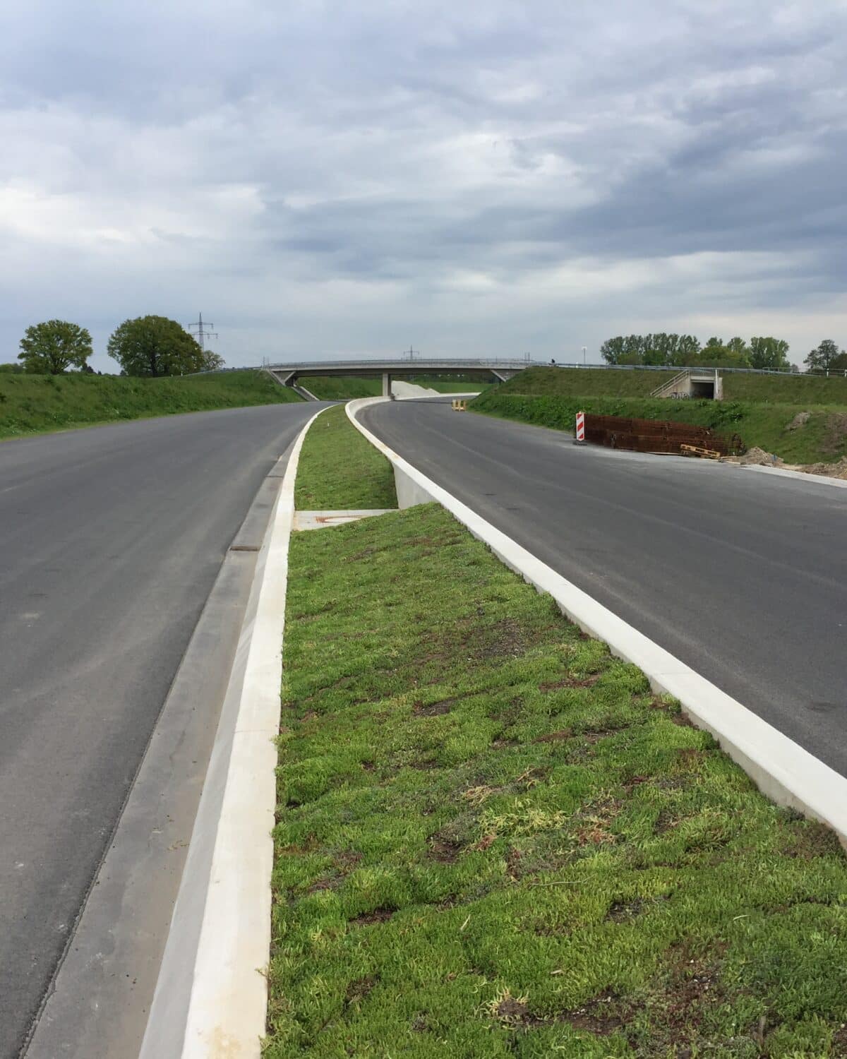 Para el proyecto de la A33, se colocó un total de 11.500 metros cuadrados de mantas de Sedum en un tramo de 7,9 km entre Ummeln y Steinhagen. La instalación corrió a cargo de Internationale Geotextil GmbH, con un equipo de cinco personas trabajando in situ durante todo un mes. Cada manta de 1,2 metros de ancho se colocó perpendicularmente al sentido del tráfico y se ancló entre los soportes de hormigón de la mediana mediante pasadores de alambre.