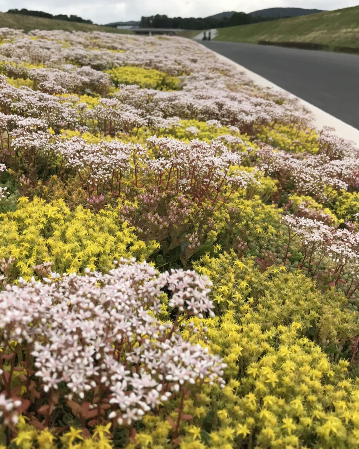 Esta inteligente estratificación hace prácticamente imposible que se establezcan especies invasoras, gramíneas o incluso árboles como el abedul, el sauce o el saúco. Las condiciones de escasez de nutrientes que disuaden a otras especies crean el nicho perfecto para que prospere el Sedum. Incluso en un entorno hostil como la mediana de una autopista, las plantas florecen y atraen a polinizadores como las abejas cuando están en flor.