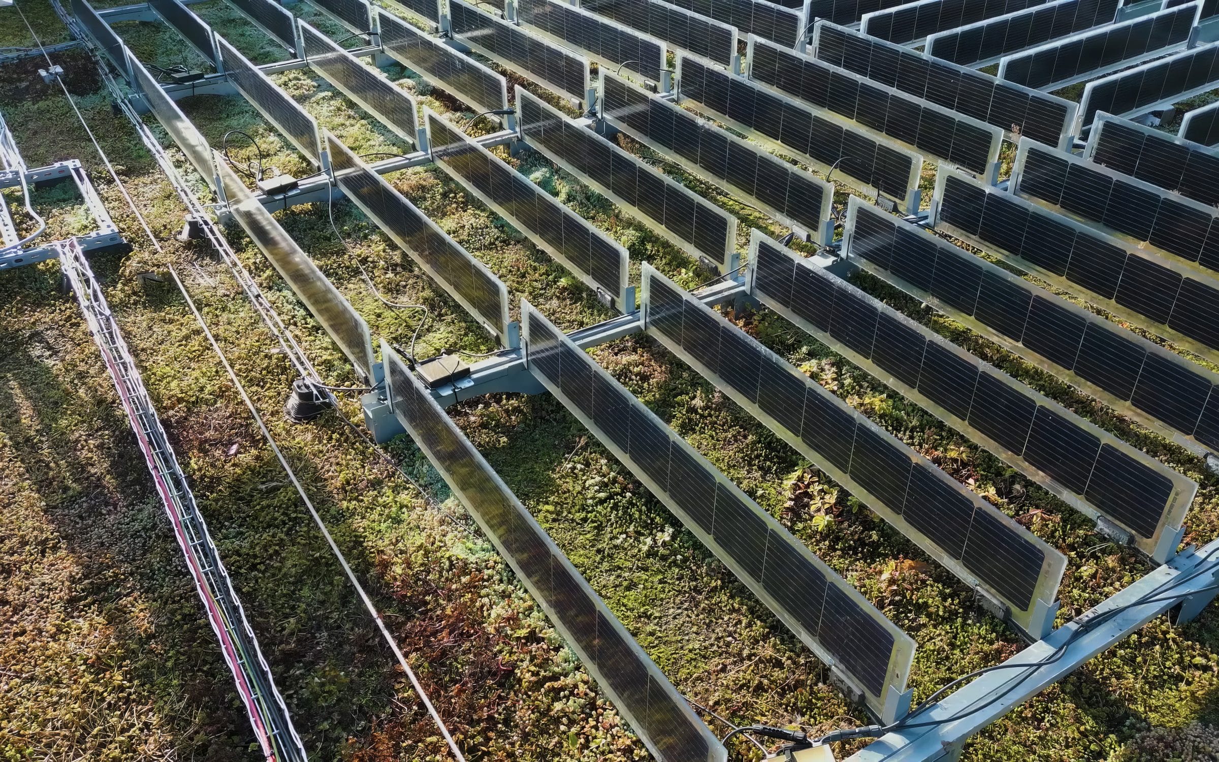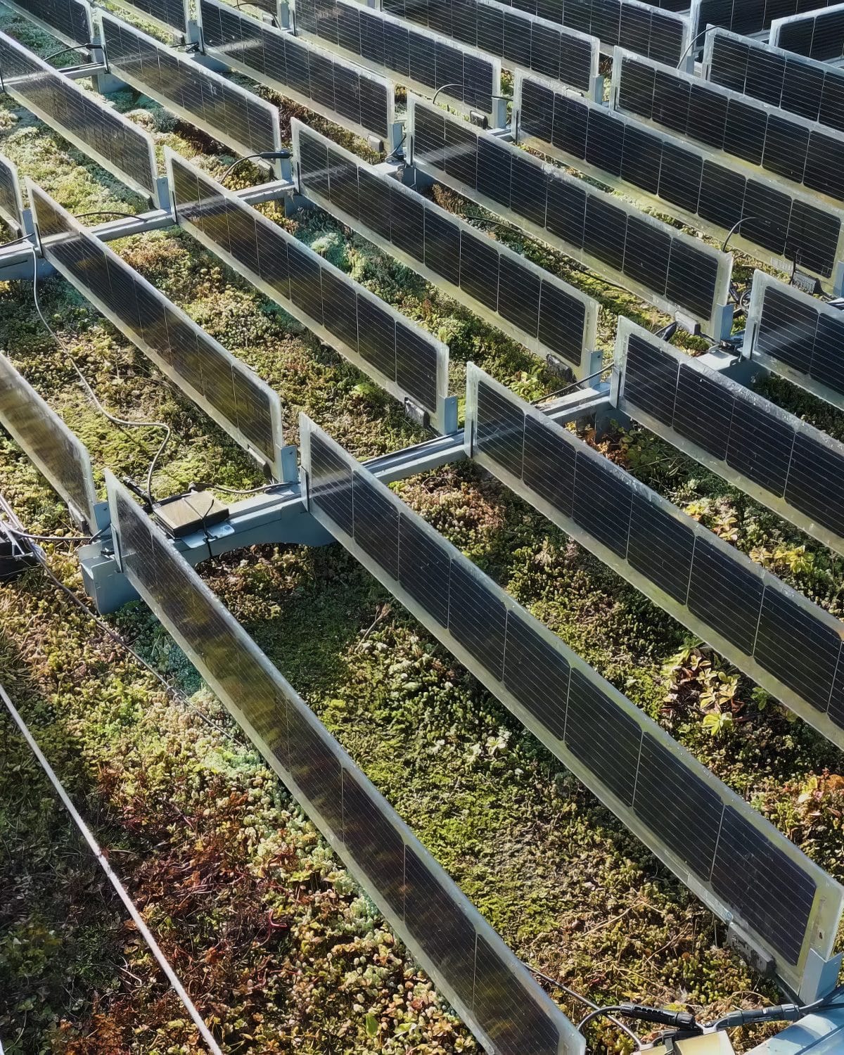 Con los paneles verticales Over Easy Solar, recibirá un sistema totalmente integrado: tejado verde, paneles solares, marcos de montaje y todos los materiales necesarios.