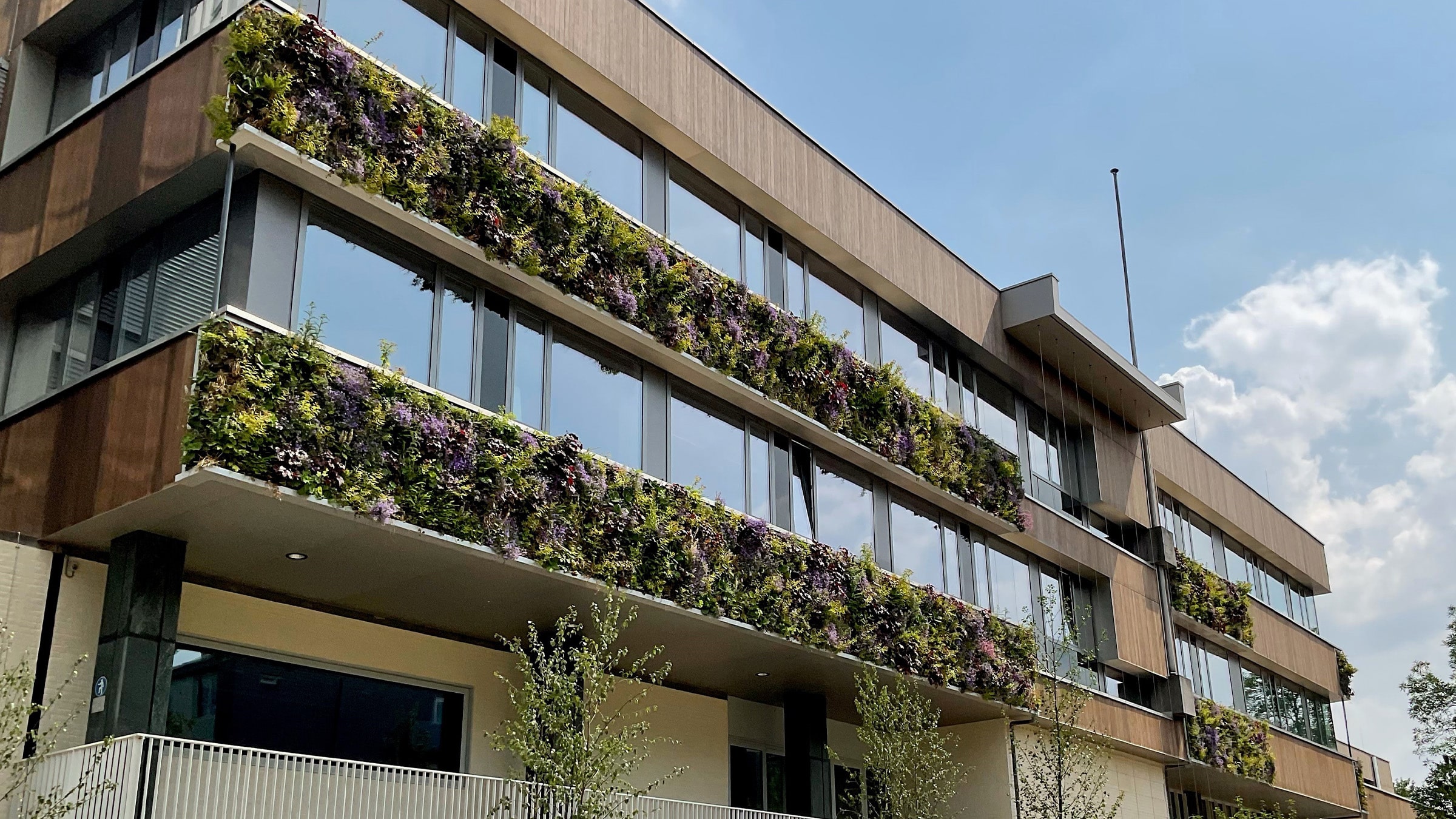 Con una fachada verde intensiva, se han colocado acentos en la fachada para resaltar zonas importantes del edificio. La flexibilidad del sistema de fachada verde de Sempergreen hizo posible este planteamiento.