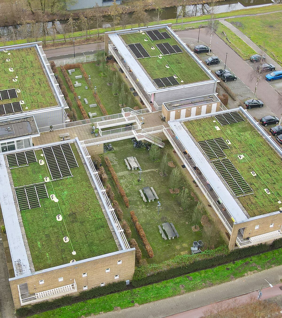Sempergreen contrató a nuestros socios Wallaard (instalación de tejados verdes) y SamenStromen (instalación de sistemas de energía solar fotovoltaica) como socios de ejecución, cuidadosamente seleccionados entre varios candidatos. Juntos ofrecieron una solución integral que combina a la perfección la tecnología de cubiertas verdes y la energía solar. ¿El resultado? Una sinergia perfecta entre flora y energía solar, que optimiza cada centímetro cuadrado del tejado.