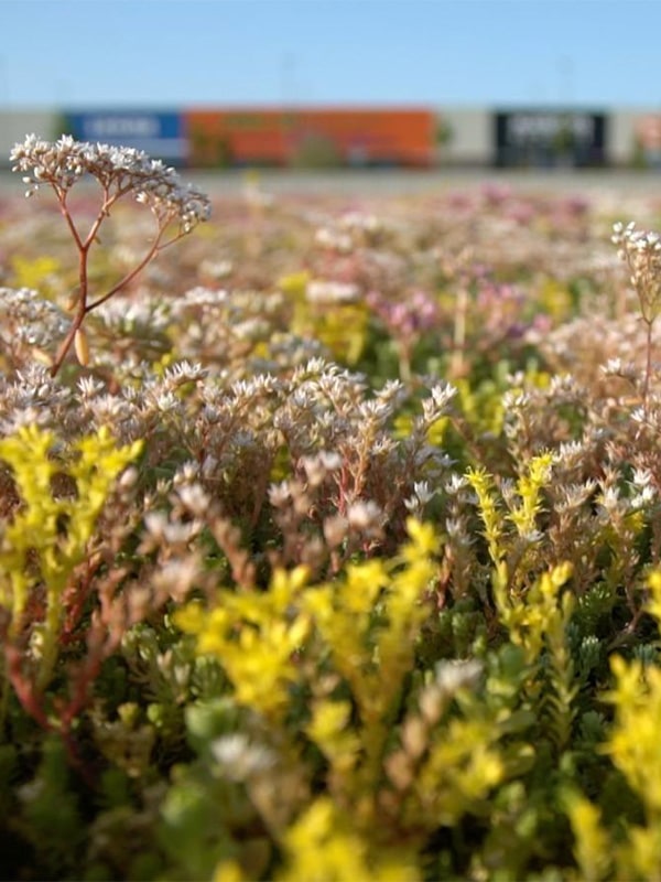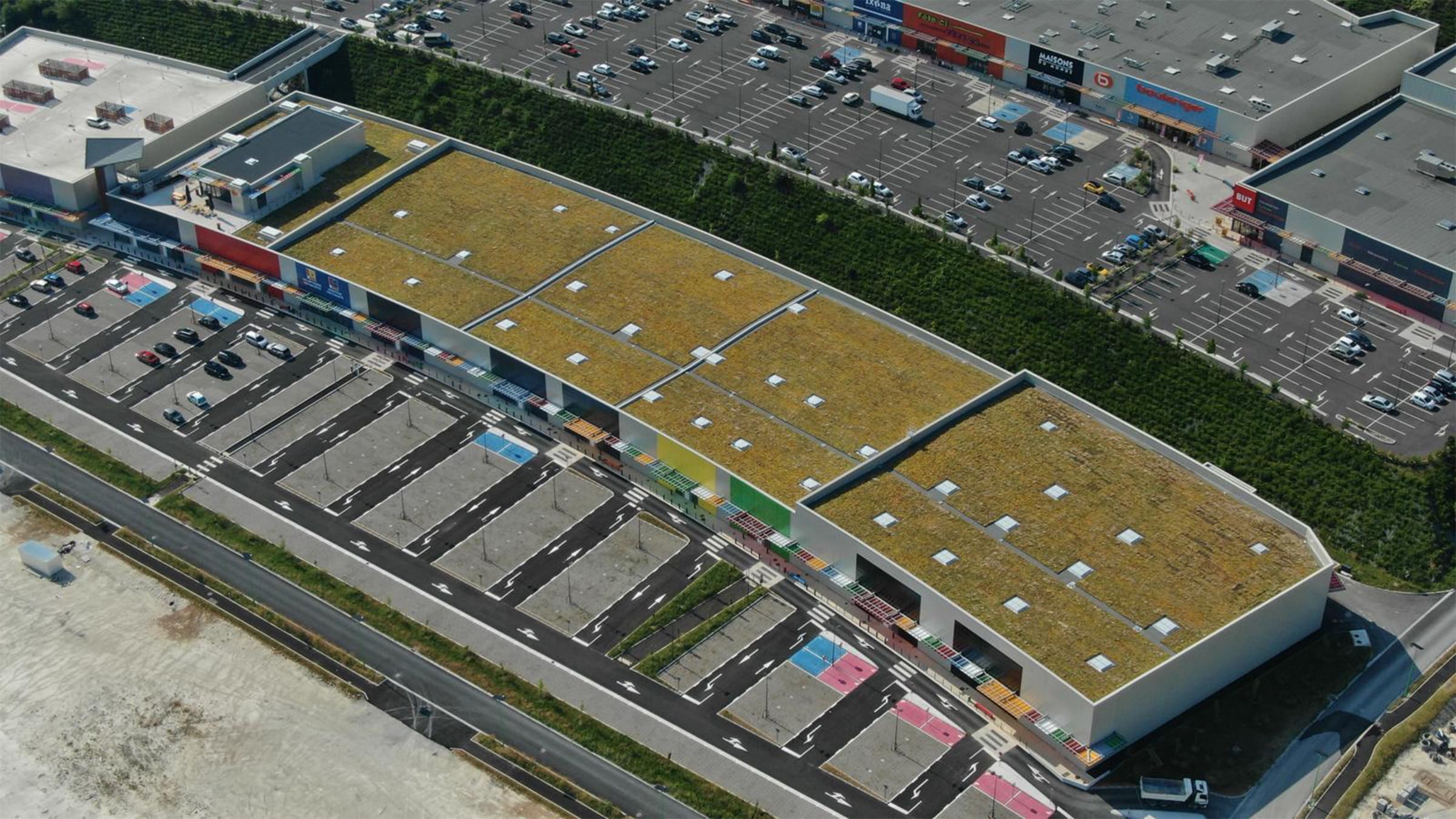 El tejado de estos locales comerciales está equipado con un sistema de cubierta verde Urbanscape en combinación con tepes de Sedum de Sempergreen. Este innovador sistema de cubierta vegetal ligera tiene una gran capacidad de retención de agua. Completamente saturado de agua, este sistema de cubierta verde sólo pesa 65 kg / m². La cubierta de Sedum absorbe anualmente 4.800 m² de agua de lluvia, lo que equivale a casi dos piscinas olímpicas. Una absorción tan elevada supondrá una importante contribución a la amortiguación del agua en el entorno local. Además, la cubierta verde tiene un impacto importante en la refrigeración del edificio durante los meses de verano, así como en la reducción del efecto isla de calor en esta zona urbanizada. Esto convierte a este sistema de cubierta verde en la solución ligera ideal para cualquier tipo de tejado.