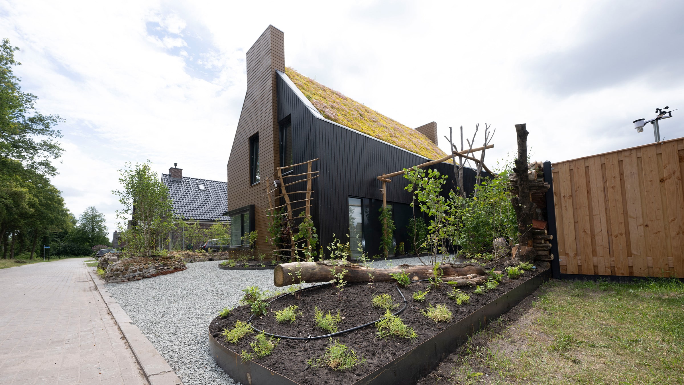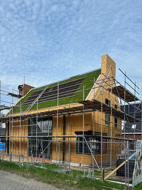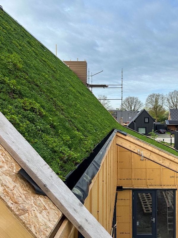 El sistema de cubierta vegetal inclinada Sempergreen forma una corona natural en esta casa de base biológica. Diseñado para aplicaciones inclinadas, el sistema de vapor abierto proporciona tanto estabilidad como vegetación viva: un tejado que respira igual que el resto de la casa. La vegetación de Sedum precultivada se adapta perfectamente al clima de Frisia, reduciendo el calor en los meses de verano. Mejora la calidad del aire, capta el agua de lluvia y suaviza la moderna geometría de la casa con un toque de naturaleza.