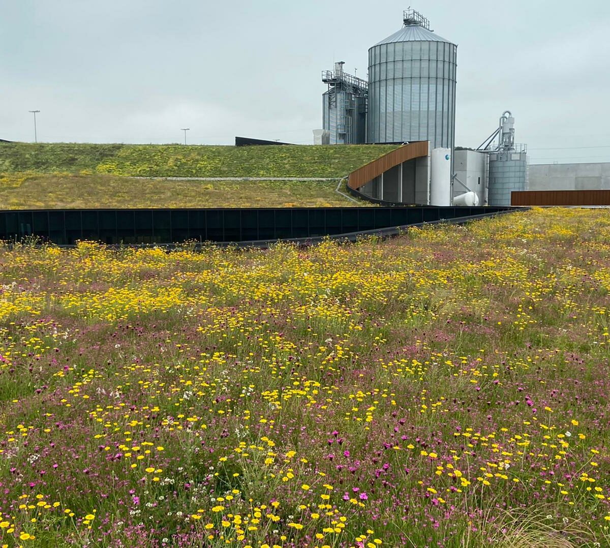 En la propiedad de SOPREMA Bélgica, el tejado de Sedum y hierbas contiene de 4 a 6 tipos de Sedum y de 20 a 25 tipos de hierbas. Mientras que el Sedum da al tejado un aspecto verde durante todo el año, plantas como la manzanilla y los claveles crean un hermoso techo floral en primavera y verano. Esta diversidad de plantas y flores atrae también a polinizadores como abejas y mariposas y contribuye positivamente a la biodiversidad de la zona.