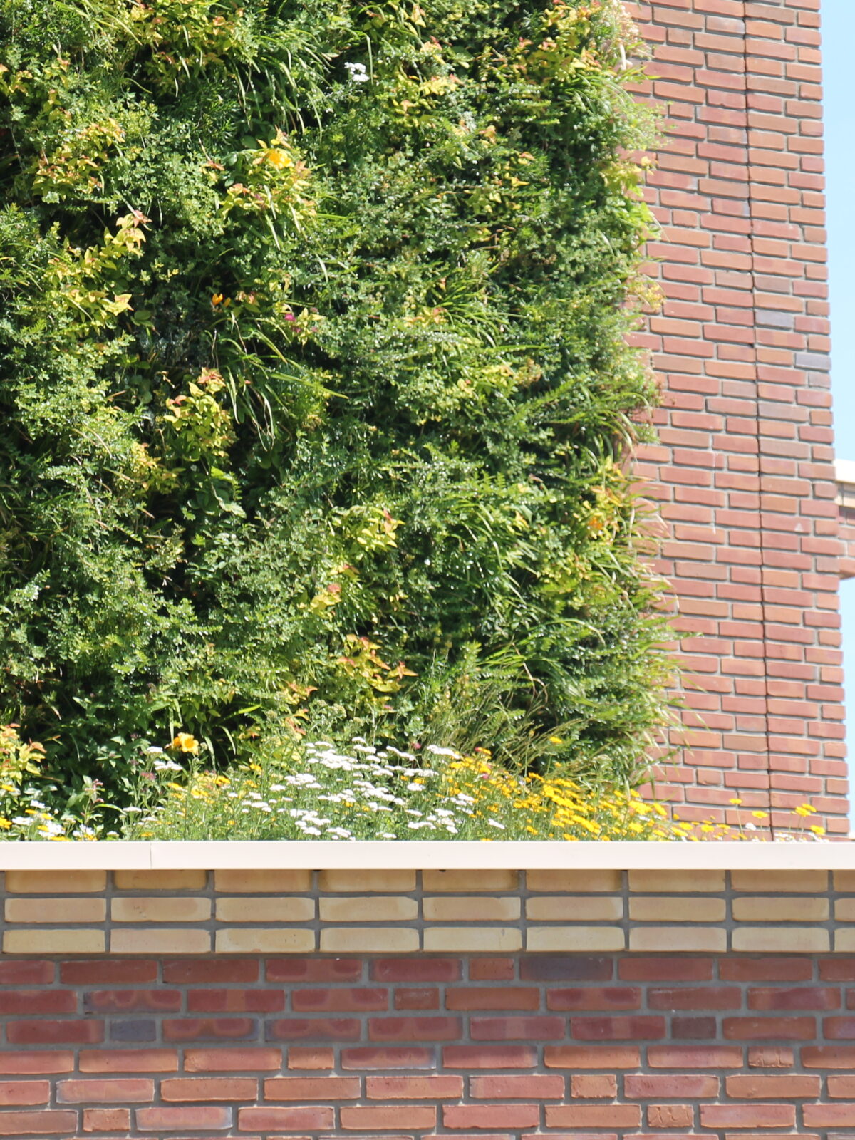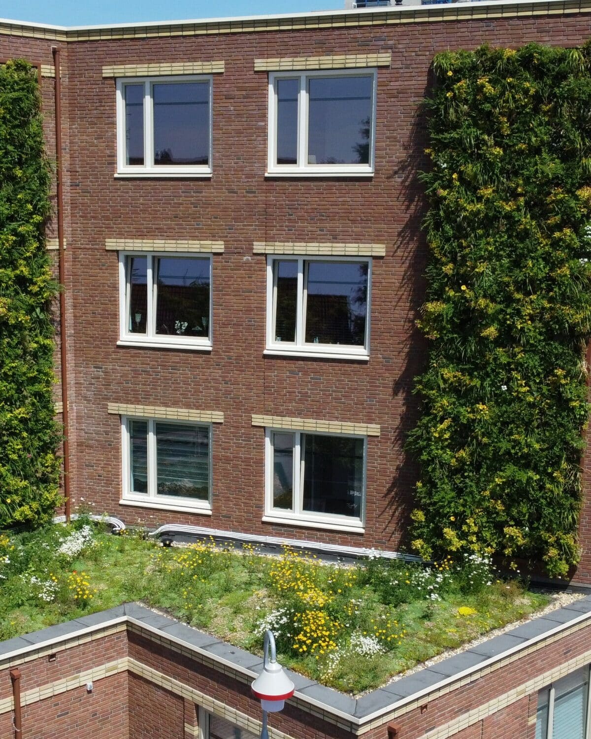 Los dos SemperGreenwalls son el centro de atención de Haagse Hendrik. Juntos, añaden más de 40 metros cuadrados de vegetación vertical a las fachadas, con 17 especies vegetales cuidadosamente seleccionadas. Con 78 plantas por metro cuadrado, el resultado fue un muro con vegetación desde el primer día. Cada planta desempeña su papel, filtrando el polvo fino, almacenando el agua de lluvia y proporcionando lugares de anidamiento y alimentación para la fauna urbana. El sistema automatizado Plant Care System controla el riego y la nutrición a distancia, manteniendo las fachadas vivas en todas las estaciones con un mantenimiento mínimo.