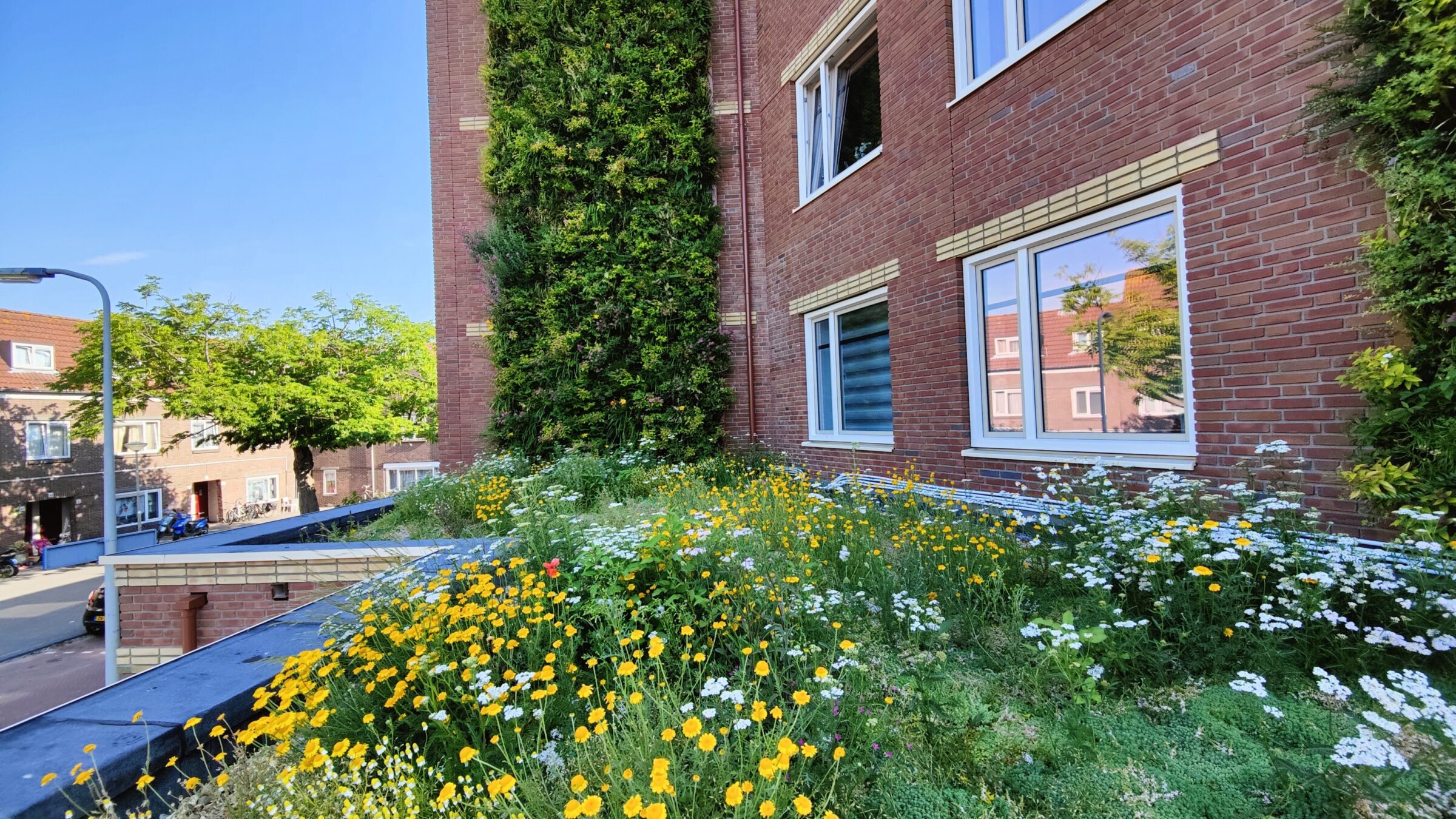 El tejado principal del edificio de apartamentos está equipado con una mezcla de Sedum y hierbas, mientras que los tejados de las viviendas unifamiliares cuentan con bandejas ligeras de Sedum. Estos tejados vivos absorben el agua de lluvia, aíslan las viviendas y contribuyen a la biodiversidad local. Para los residentes, también ofrecen hermosas vistas verdes, un recordatorio visual de cómo las pequeñas superficies pueden marcar una gran diferencia medioambiental. Juntos, los tejados y las fachadas convierten a Haagse Hendrik en un auténtico "barrio esponja", capaz de gestionar el calor y la lluvia de forma natural.