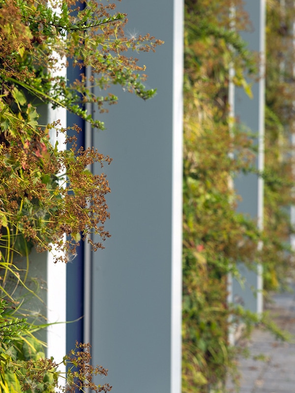 Durante el proceso de diseño, se ha utilizado como directriz la filosofía Cradle to Cradle®, que significa que todos los materiales utilizados en el proceso de construcción pueden reutilizarse o reciclarse fácilmente. Basándose en esta filosofía, también se decidió colocar ocho muros SemperGreenwall certificados Cradle to Cradle en la fachada del edificio.