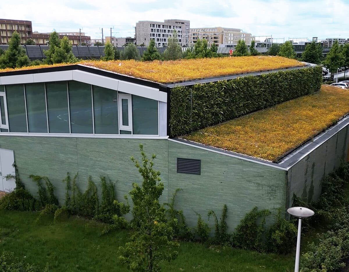 Se encargó a T&G Group el resto de la jardinería. Instalaron en el tejado del gimnasio un sistema de cubierta vegetal de Sempergreen. Para los residentes del complejo de apartamentos adyacente era muy importante que el edificio fuera atractivo a la vista. Ahora, desde los balcones se tiene una bonita vista de la fachada verde y el tejado verde solar.