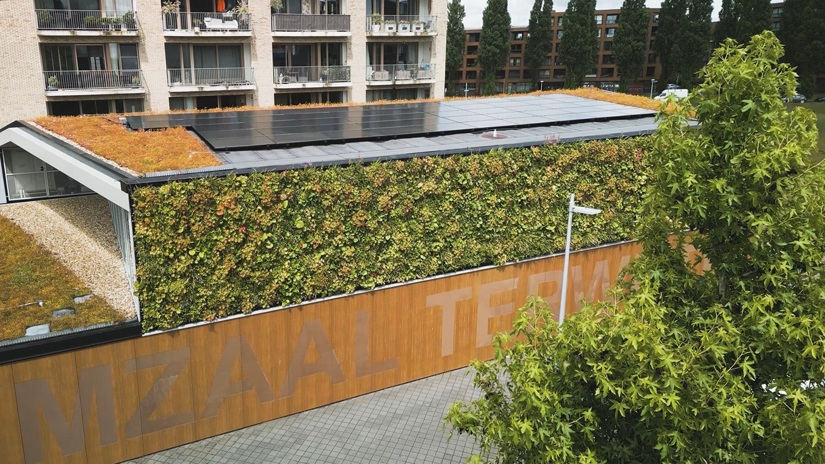 Los tejados verdes del gimnasio Terwijde añaden una dimensión adicional a la naturaleza sostenible del edificio. Cubiertos de plantas y vegetación, estos tejados verdes reducen la absorción del calor, mejoran la calidad del aire y ayudan a retener y drenar el agua de lluvia. Esto contribuye a una gestión equilibrada de las aguas urbanas y ayuda a prevenir inundaciones.