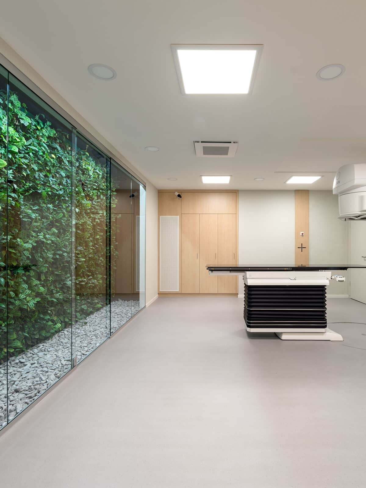 El corazón del centro de centro de radioterapia es la sala de tratamiento, construida con gruesos muros de hormigón para protegerla de la radiación. Estos espacios son esenciales, pero a menudo se perciben como fríos e intimidatorios. Mediante la integración de un SemperGreenwalllos pacientes disfrutan ahora de una vista cálida y natural durante la terapia. La pared, aunque encerrada en vidrio por razones de higiene, crea un escape visual que ayuda a suavizar el carácter de alta tecnología de la sala.