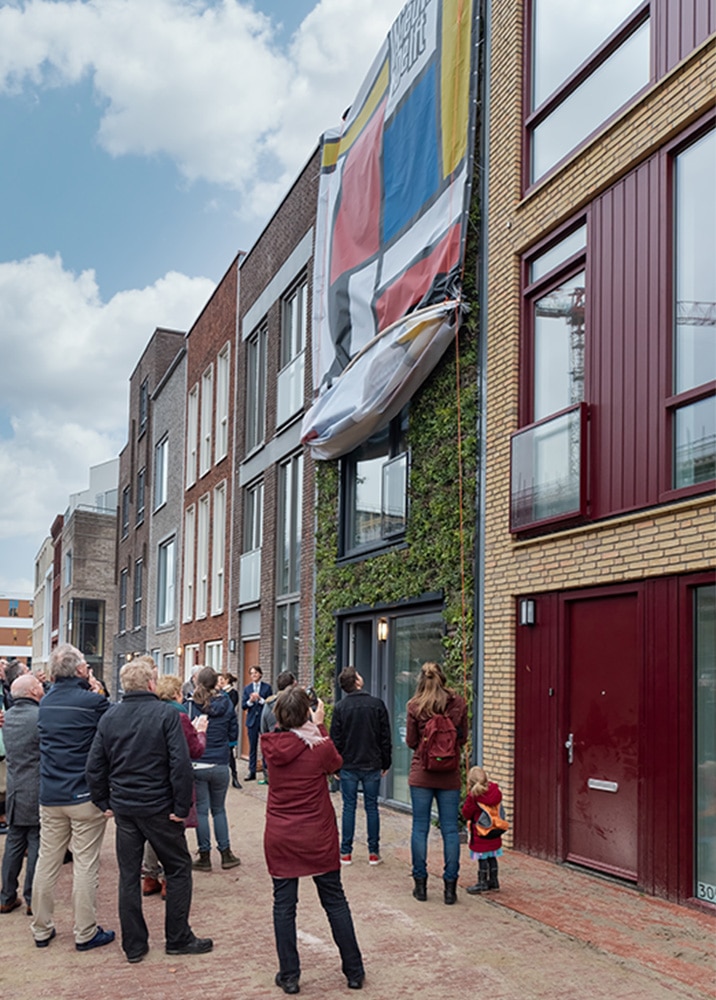 Nueva Delft" es una nueva urbanización a gran escala cerca de la estación de tren de la ciudad holandesa de Delft. Coendersbuurt es uno de los primeros barrios nuevos de Nueva Delft. Como parte del nuevo barrio, nueve espaciosas casas adosadas han sido diseñadas por los arquitectos de FARO, por encargo de Ballast Nedam Development. Cada casa tiene su propio diseño particular. La vivienda más llamativa tiene una pared viva que cubre completamente la fachada. El diseño se creó durante el "Año Mondrian" en 2017, que celebraba al pintor holandés Piet Mondrian, famoso por su arte abstracto de la primera mitad del siglo XX. Su estilo característico, con líneas rectas y bloques de colores primarios, inspiró el diseño del muro verde. La última planta del muro fue colocada por los propietarios de la casa y el concejal local.