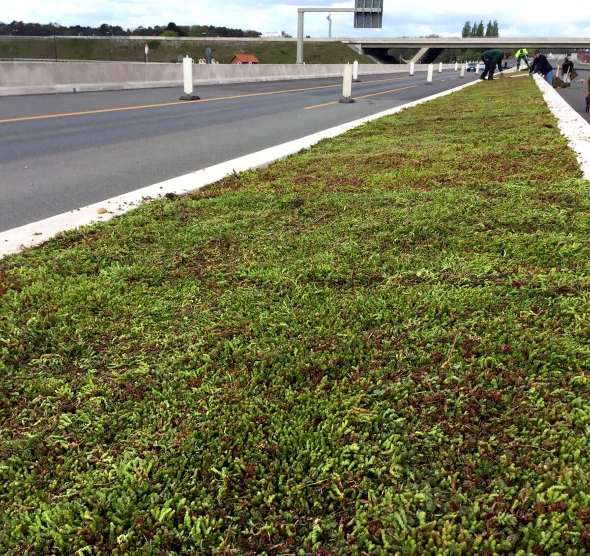 El objetivo de este proyecto era convertir la mediana de una transitada autopista alemana en un espacio verde visualmente atractivo y ecológicamente funcional, sin aumentar los costes de mantenimiento. Los planificadores de la carretera buscaban una cubierta vegetal que suprimiera el crecimiento de malas hierbas, se mantuviera ordenada todo el año y eliminara la necesidad de segar, podar o regar. Tras varios años de experimentación con distintos métodos de plantación, la respuesta llegó en forma de mantas vegetales de Sedum de Sempergreen.
