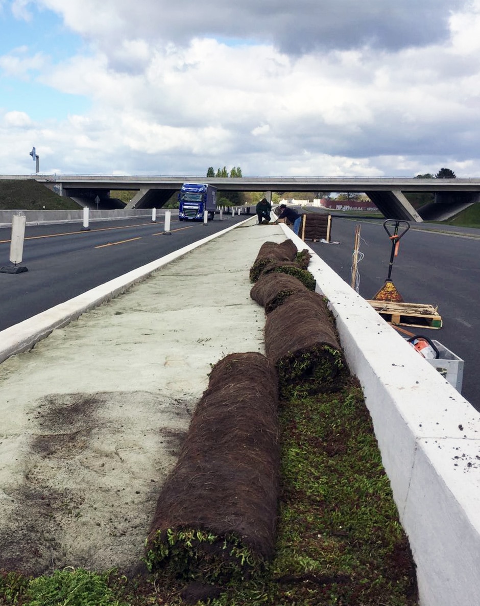 Para el proyecto de la A33, se colocó un total de 11.500 metros cuadrados de mantas de Sedum en un tramo de 7,9 km entre Ummeln y Steinhagen. La instalación corrió a cargo de Internationale Geotextil GmbH, con un equipo de cinco personas trabajando in situ durante todo un mes. Cada manta de 1,2 metros de ancho se colocó perpendicularmente al sentido del tráfico y se ancló entre los soportes de hormigón de la mediana mediante pasadores de alambre.