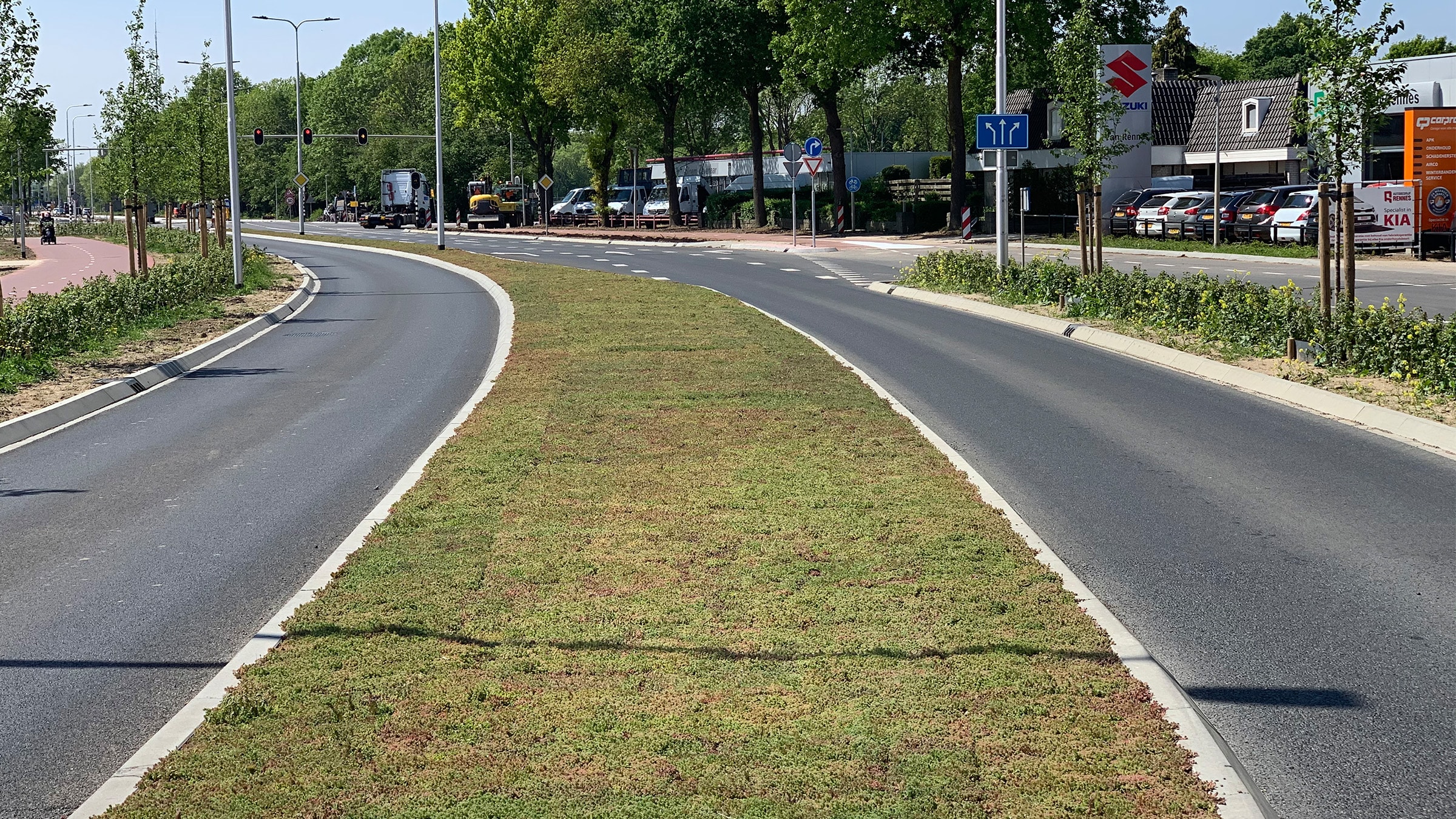 En Zevenaar, una ciudad neerlandesa cercana a la frontera alemana, se ha dado un giro verde a las infraestructuras. Una larga mediana y una isla de tráfico se han transformado con 1.100 m² de cubierta vegetal de Sedum, convirtiendo una franja antes gris y sin vida en una parte viva de la ciudad. El resultado no es sólo una calle más atractiva, sino un paisaje resistente y biodiverso que demuestra que las carreteras no tienen por qué ser estériles.