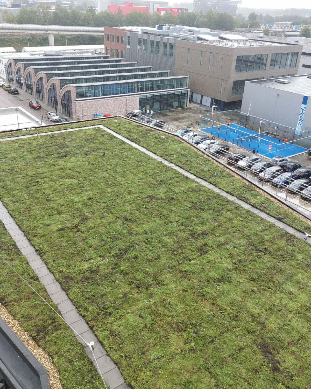 Este techo de retención reduce significativamente la presión sobre el sistema de alcantarillado urbano. Almacena 37 200 litros de agua de lluvia, lo que supera con creces las normativas de Ámsterdam, y se drena lentamente con una capacidad controlada de 1 litro/m² por hora, incluso en un techo plano.