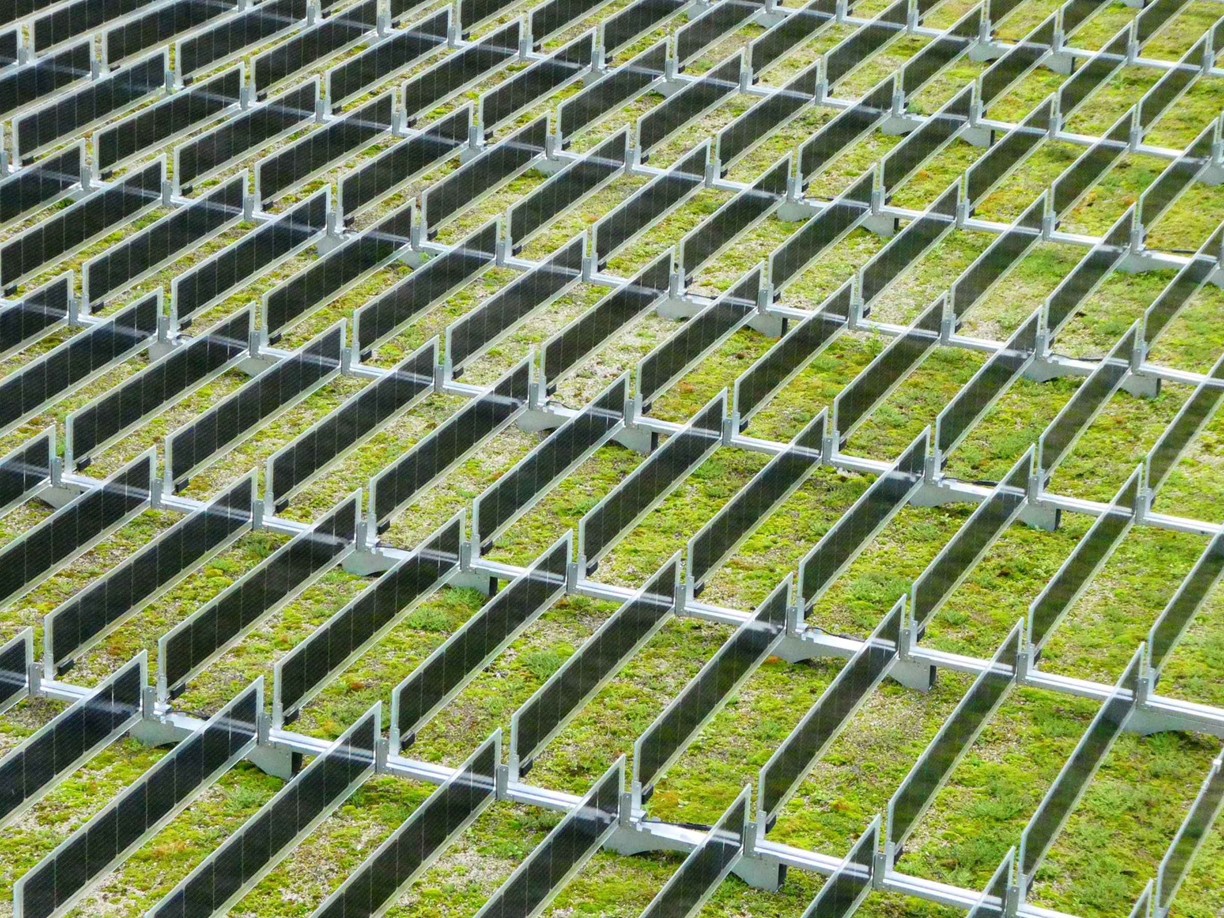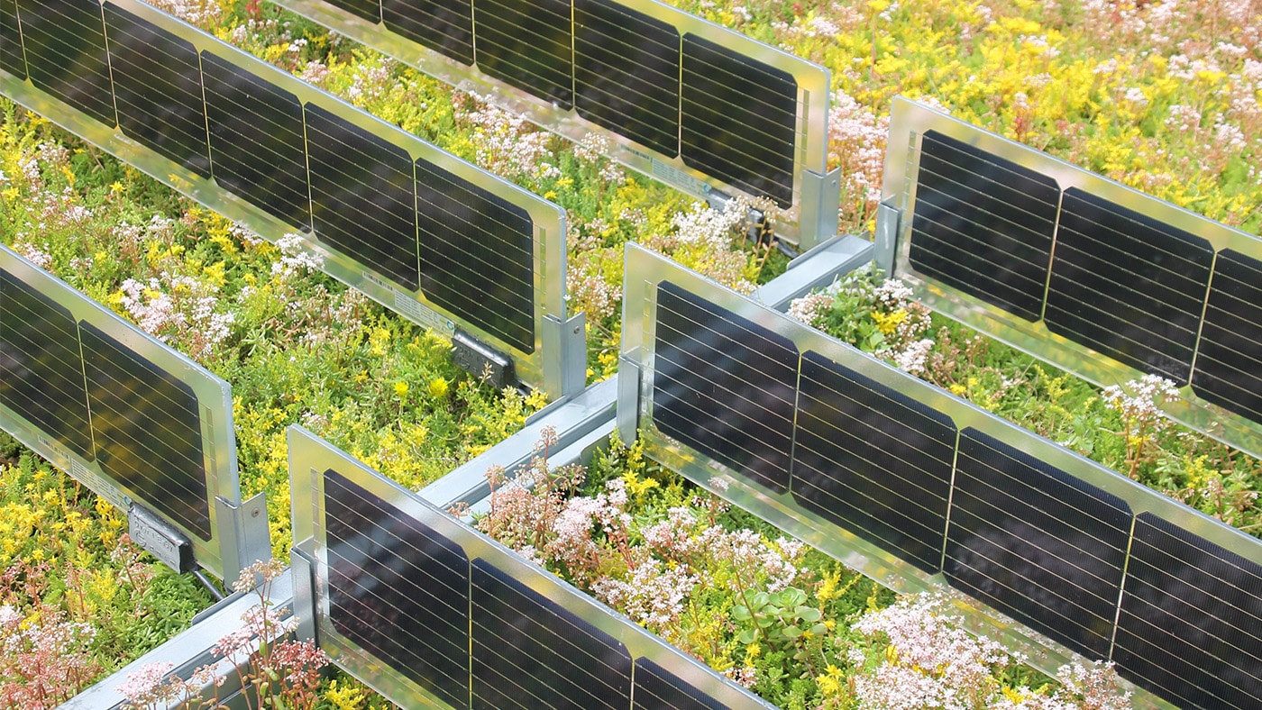 Los paneles fotovoltaicos verticales garantizan que las plantas y los paneles solares se complementen entre sí. Las plantas reflejan la luz solar hacia los paneles solares (efecto albedo) y proporcionan refrigeración al tejado. Esto aumenta significativamente la producción de energía de esta solución fotovoltaica. Gracias a su diseño vertical, el tejado verde recibe suficiente luz y agua de lluvia, y su mantenimiento es sencillo.